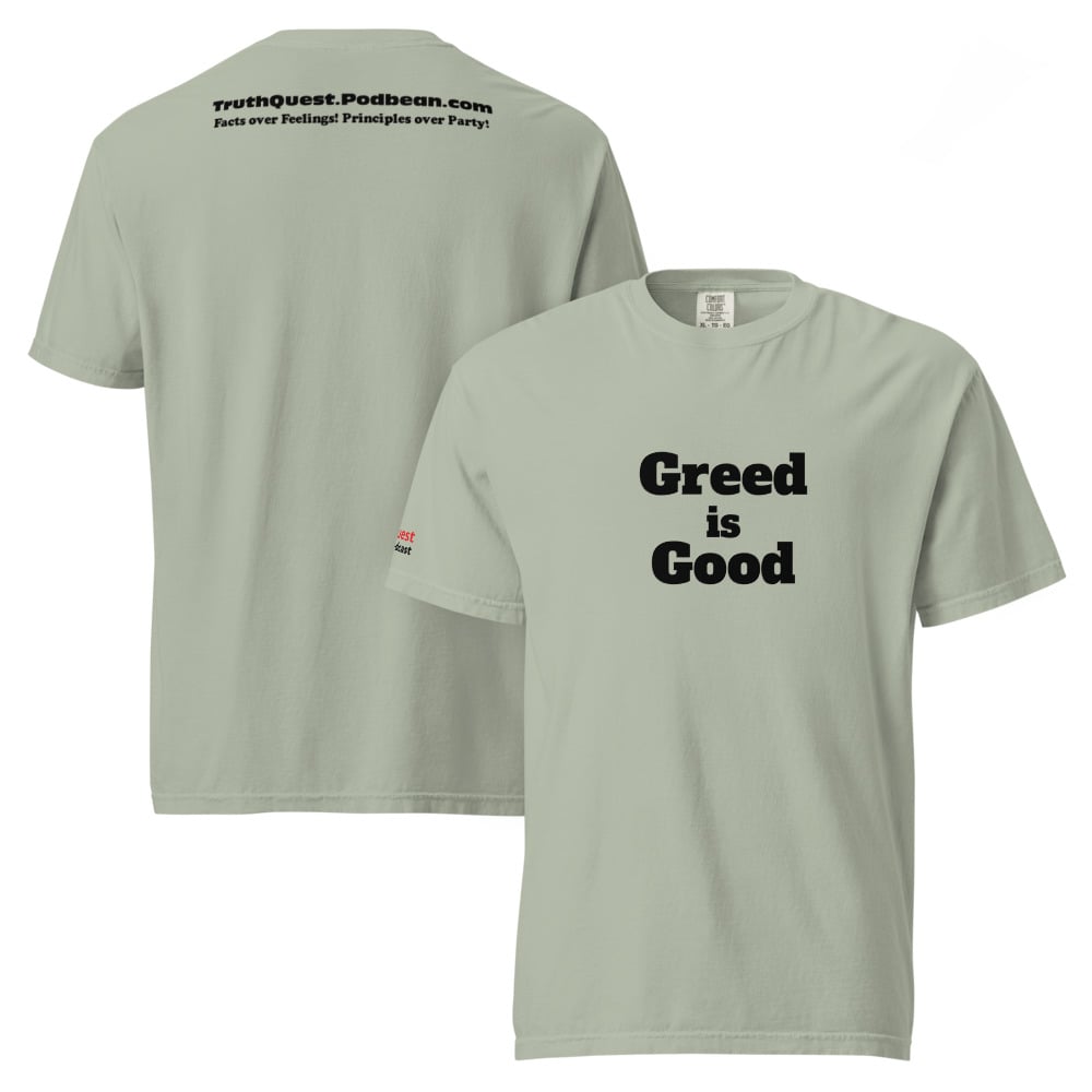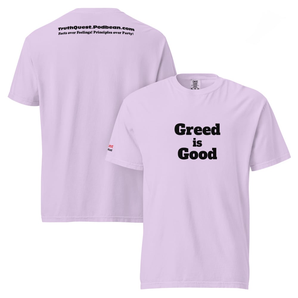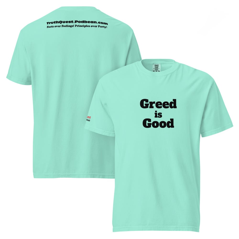 Inspired by Episode 355 - The Truth About Capitalism and Socialism, this shirt sports the abbreviated, famous quote by Gordon Gekko in the 1987 movie, Wall Street.