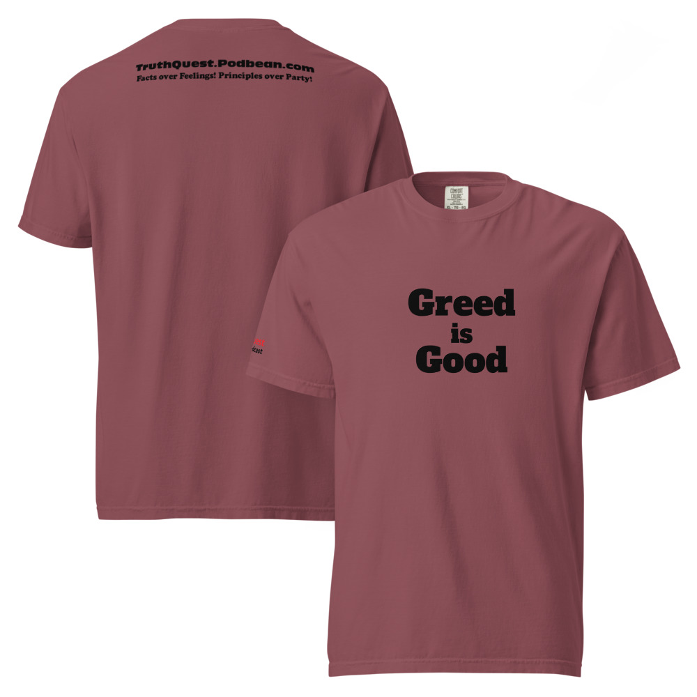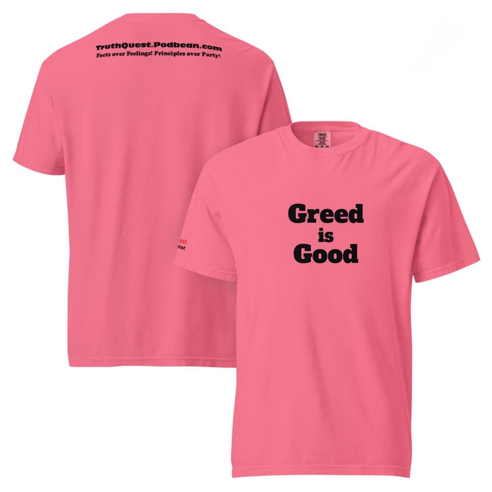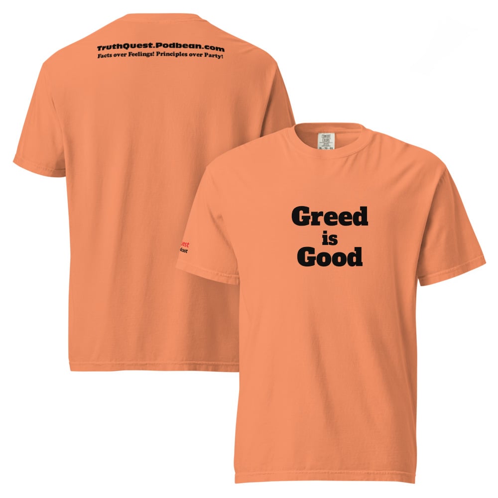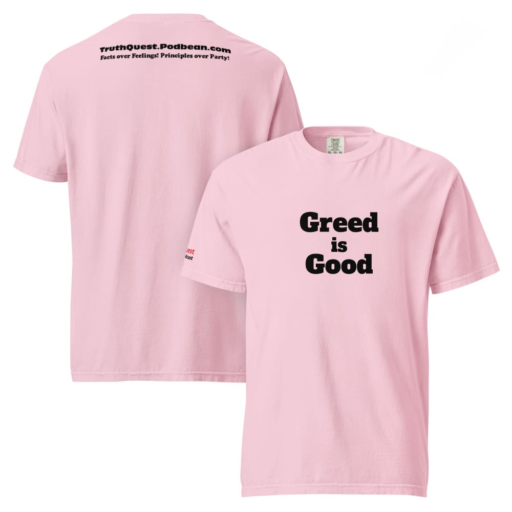 Inspired by Episode 355 - The Truth About Capitalism and Socialism, this shirt sports the abbreviated, famous quote by Gordon Gekko in the 1987 movie, Wall Street.